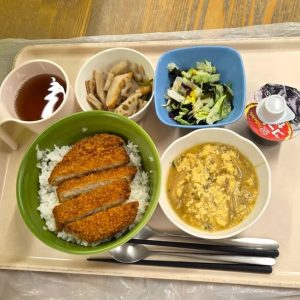 〈メニュー〉かつ丼、れんこんの煮物、海藻サラダ、コーヒーゼリー