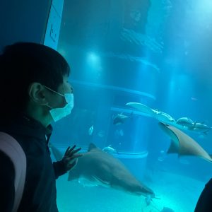 中に入ると、水槽の中の魚たちを目で追いながら夢中になっている様子が見られました。一番釘付けになっていたのは、やはりジンベエザメで圧倒的な存在感でした。